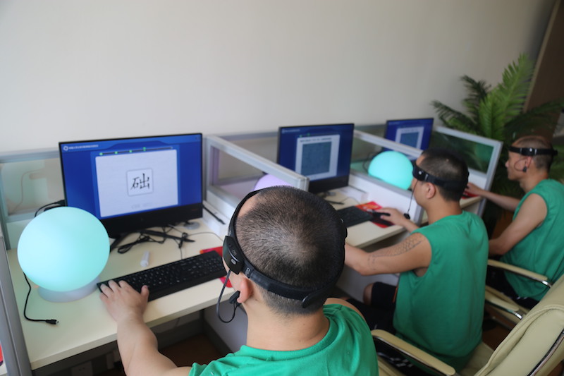 6月26日,在青东所心理健康指导中心的脑波认知训练室,10位身穿绿色上衣的戒毒人员坐在电脑前,正在进行认知训练。他们头戴一个黑色头箍,这是一个皮电监测设备,该设备与电脑旁边的白色感应球相连接。如果戒毒人员注意力集中,感应球将变成绿色,如果注意力分散,感应球将变成红色。