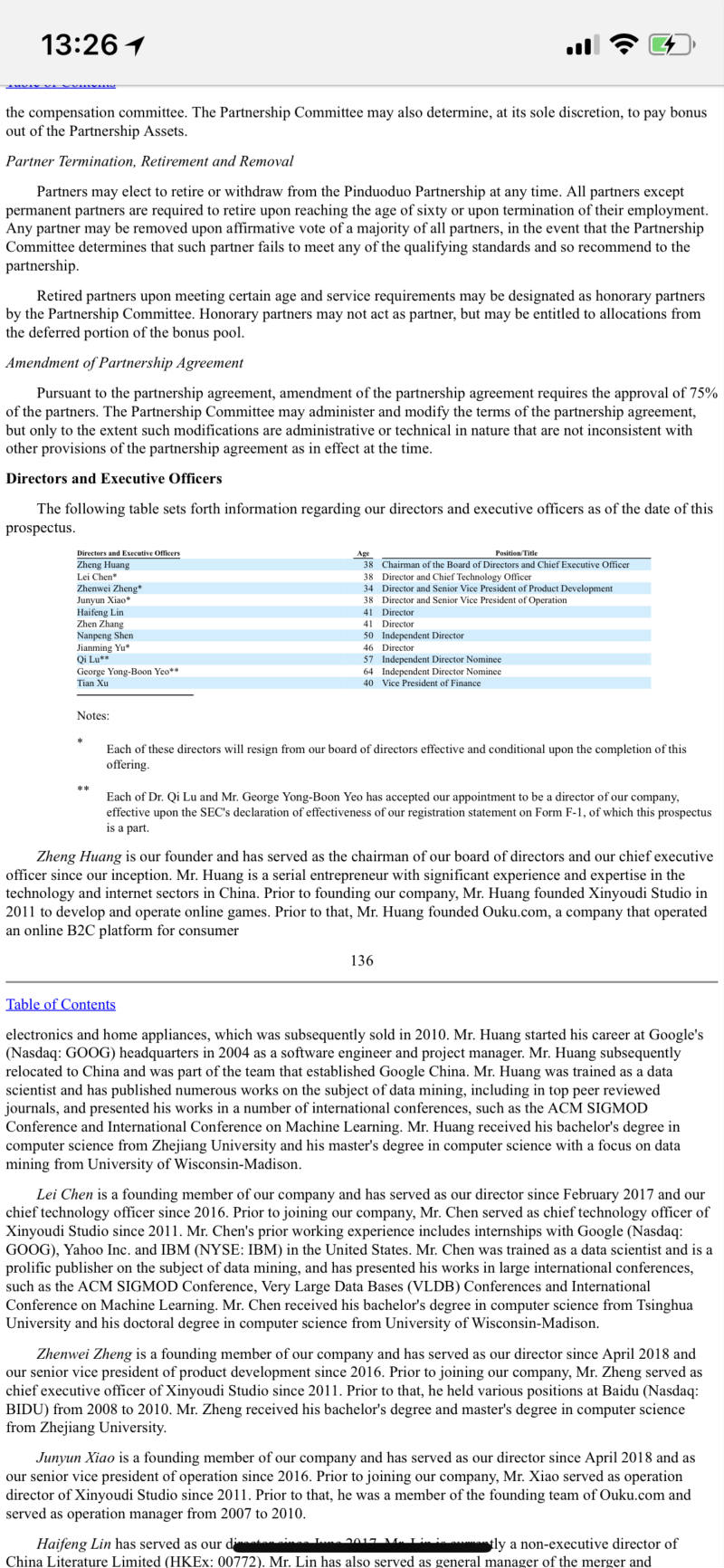拼多多招股书显示,陆奇将担任拼多多独立董事和薪酬委员会主席。另外还发现拼多多实行类似阿里巴巴的合伙人制,即合伙人委员会可控制董事会提名。