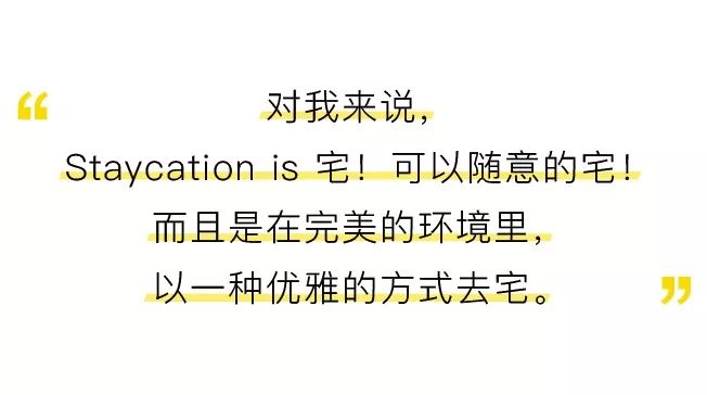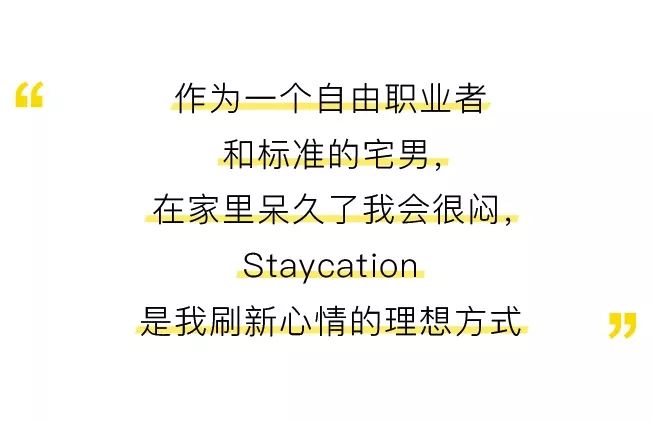Staycation也叫做“宅度假”,身边像 Sean 这样的 Staycationer 也并不在少数,当周一到周五被工作、社交、家庭和压力填满,越来越多向往逃离又囿于时间、路程限制的都市人选择在周四打开手机,选一家心仪的酒店给自己预定一个不一样的周末。这像是一个小小的仪式,让他们从常规中暂时抽离。