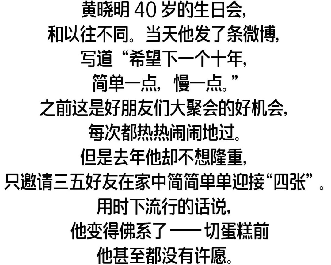 光阴一度二十年。曾经,作为明星活在别人的眼光中,不停四处奔波,昼夜颠倒也不敢停下来。而到了不惑之年,他想慢下来了,不去刻意证明什么,尽力做事之后承担或好或坏的结果。然后不回头,往前看。当一个人拥有了难以企及的名望、人脉和财富,这些东西成就着他,也裹挟着他。盛名之下有人会膨胀迷失,有人会激流勇退,也有人会顶住压力,转个身翻进了更为高深幽静的山岭。