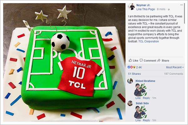 今年2月5日,内马尔26岁生日,他通过自己的Twitter、Facebook宣布与TCL达成合作,并晒出了TCL为他特别定制的生日蛋糕。