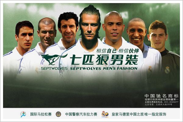 夺得皇马此行唯一指定服装赞助商时,七匹狼其实赢得不少叫好声——彼时皇马云集了贝克汉姆、罗纳尔多、齐达内、劳尔、菲戈等七大巨星,与“七匹狼”有那么点异曲同工之妙。