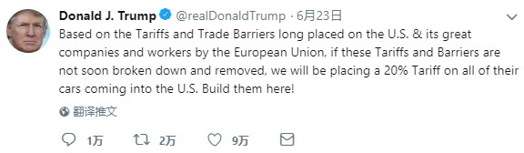 6月23日,特朗普在推特上表示如果欧盟对美国的关税和贸易壁垒不撤销,那么美国将对自欧盟进口的所有汽车,单方面征收20%的关税。
