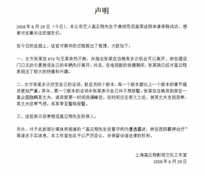 6月29日中午,高云翔涉性侵一案,二次保释申请结果在悉尼新南威尔士州高等法院公布,高云翔保释成功,保释金为300万澳元,约1465万人民币,并且需每日两次到当地警察局报道。报道称,高云翔本人身穿绿色囚服通过视频出席,脸上有胡渣,手上拿着一本书。今天下午,高云翔工作室微博发布声明,回应保释成功,否认高云翔在看守所内遭霸凌。