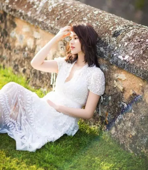 胡杏儿一袭白裙游古堡