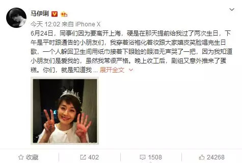 6月29日,马伊琍在微博发文称:“6月24日,同事们因为要离开上海,硬是在那天提前给我过了两次生日。你们,就是知道我从不在乎年龄,更不在乎提前五天变老。面对镜头我做了42,可是大姚居然拍出了这样的我!”她还配上姚晨拍摄的照片,照片中的她头戴王冠,向镜头摆出42手势,却因为镜像变成了24。