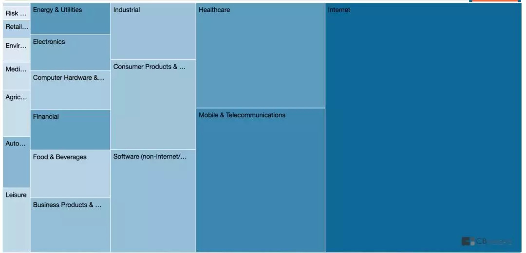 图:2017年1月到2018年3月全球投融资热度图,矩形越大代表融资案例数量越多,颜色越深代表投融资金额越高。来源:CBInsights