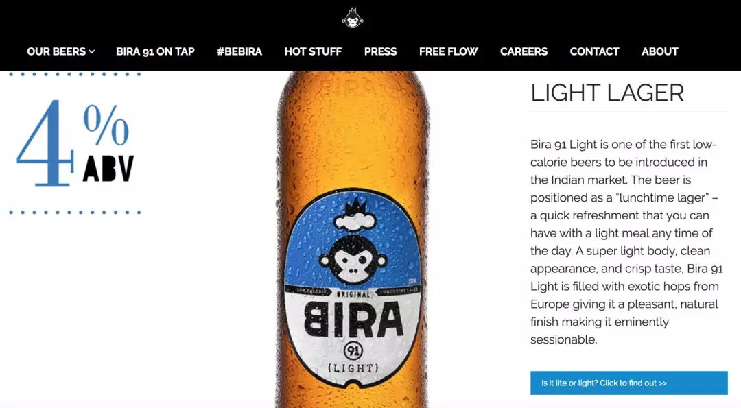 图:Light也是BIRA91的一个代表标签,在印度市场,BIRA91是最早一批引入低卡啤酒理念的品牌。来源:BIRA91官网