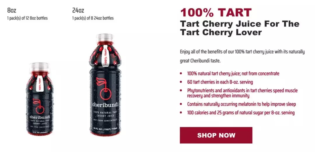 图:过去一年获得超过570万美金融资的果汁品牌CheriBundi,主打标签很简单直接——100%果汁,选择了具有较高附加值的樱桃汁这个品类,专注做樱桃汁;同时也推出来针对低热量、高蛋白、睡眠改善等功能性需求的樱桃汁。来源:CheriBundi官网