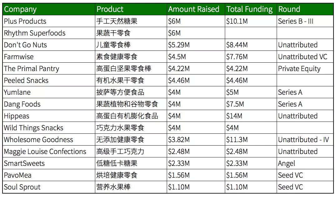 表:过去一年时间内部分获得较高融资额的零食类消费品牌公司,数据来源:CBInsights,FoodPlus整理