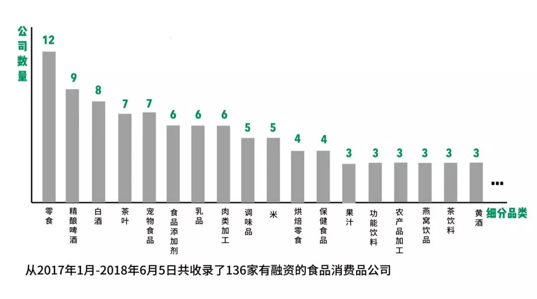 以国内的投融资数据做一个论证,2017.1.1到2018.6.5国内获得融资的136家食品消费品公司中,融资公司数最集中的三个品类分别是:零食(12起),精酿啤酒(9起),白酒(8起)。