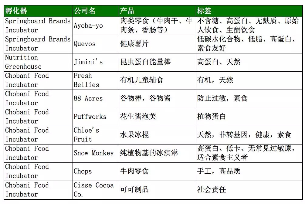 通过对百事、卡夫亨氏、CHOBANI三家孵化器孵化案例的整理,涉及零食类型的公司有10家,占这些孵化器已孵化公司案例(共36起)的近28%。
