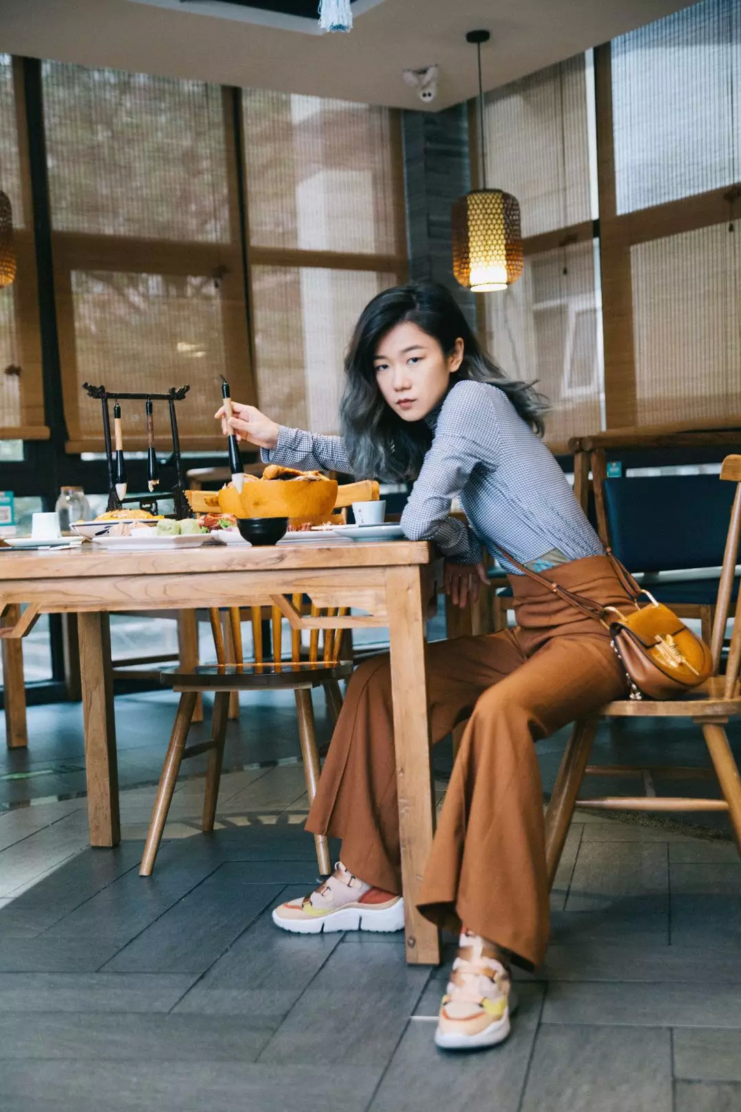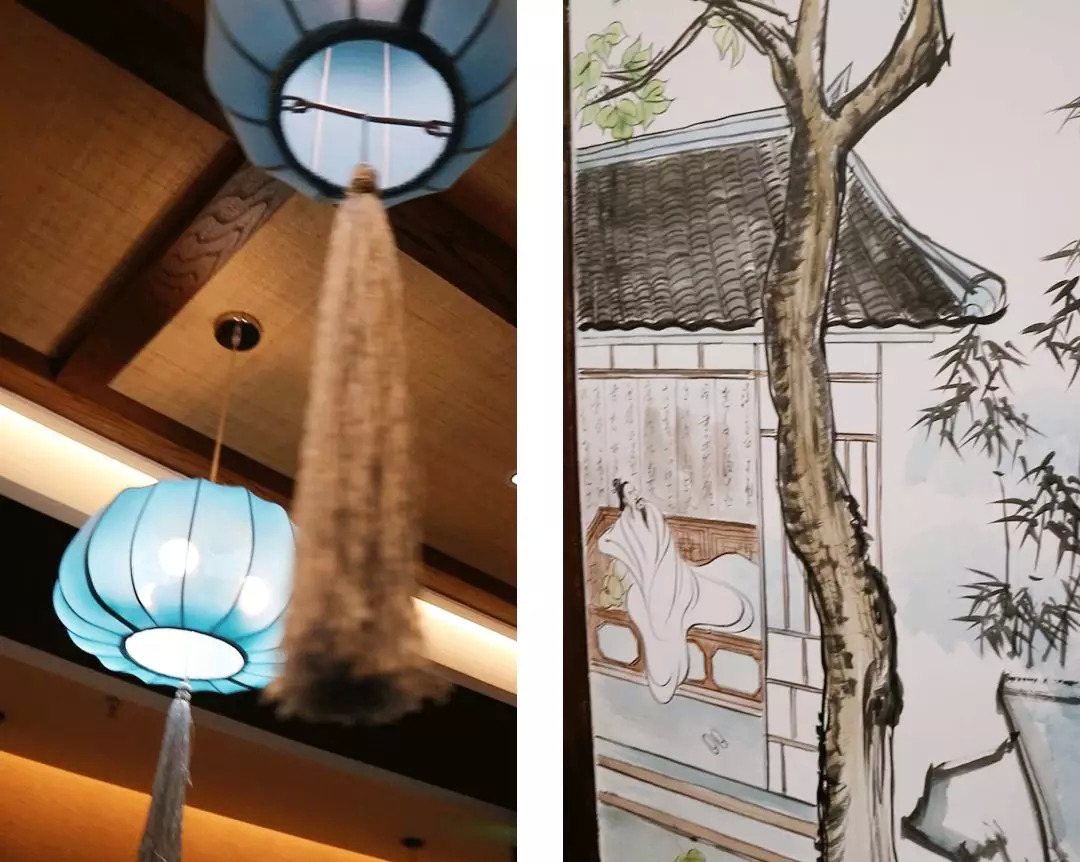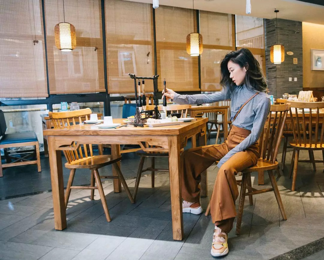 这个店也是古风的,并且有各种各样的装饰,所以得穿得简洁现代一点,颜色也不要太跳。