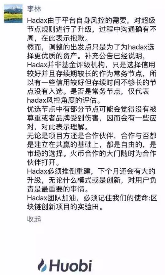 因为惹恼了一众 New Money 资本,火币创始人李林快速予以回应,表示 HADAX 并未对资本进行分级,HADAX 出了这种问题,必须推倒重建。