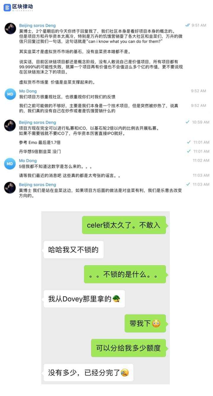 6 月 28 日,币圈开始传播一批 Celer 私募代投和丹华资本「内部撕逼」的聊天记录,爆料人称丹华资本以 2 折的价格包下了 Celer 项目的基石轮,社交媒体上大 V 称之为「五倍收割韭菜」、「不锁仓」,在区块链资本圈更是有人以 50% Carry 的价格来收 Celer 的私募份额(Carry 为佣金,50%Carry 的意思是撮合成功后拿成交额 50% 的佣金。)