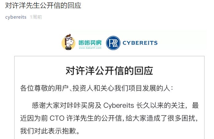 咔咔买房在 2017 年拿到了两笔有行业内知名 VC 投资的共计 2000 万人民币的融资,在今年 1 月旗下 Cybereits 区块链项目也拿到了 5000 万的 A 轮融资。但是投资者社群反应说,Cybereits 项目自从拿到融资后就没有将心思放在 Cybereits 项目的开发上,更是传言 CEO 拿融资的钱去炒币,「有种跑路的感觉」。