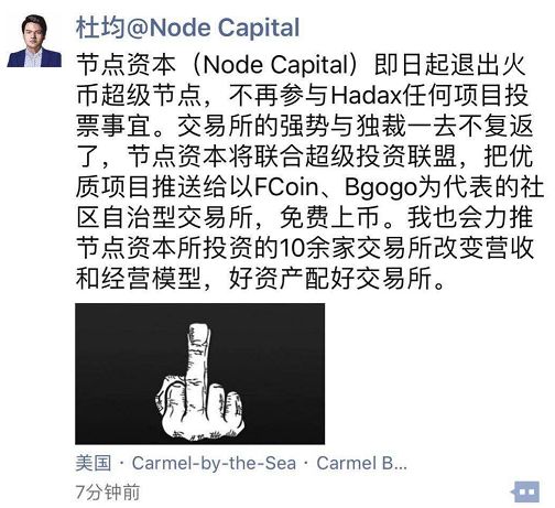 此消息一出,节点资本创始人杜均在朋友圈表示从即日起退出火币超级节点,不再参与 HADAX 任何项目投票事宜,随后赵东的 DFund 也表示退出 HADAX 超级节点,紧接着是币信资本和了得资本也宣布退出。