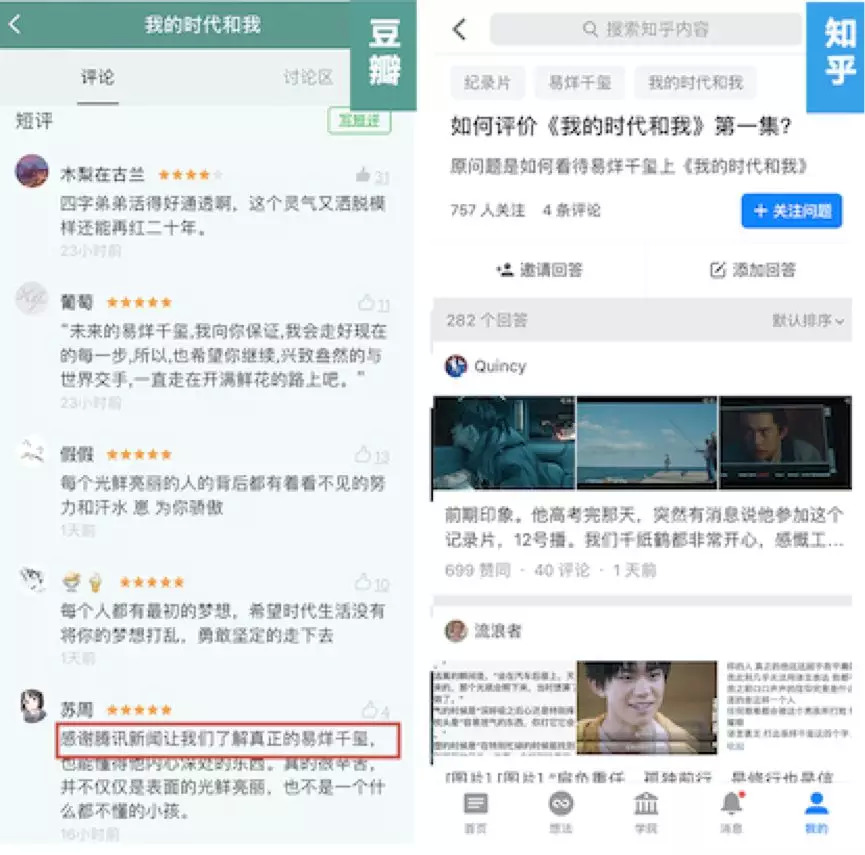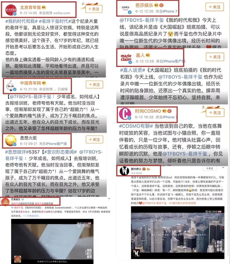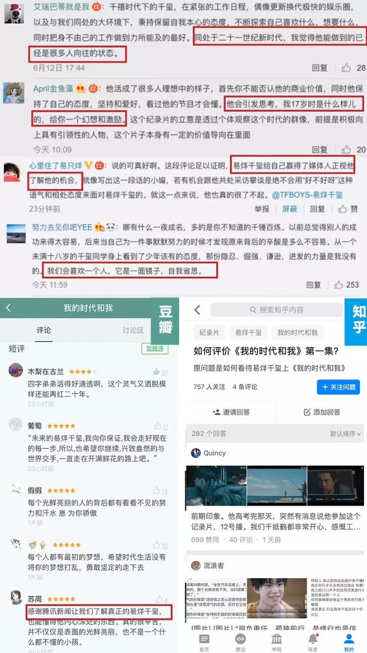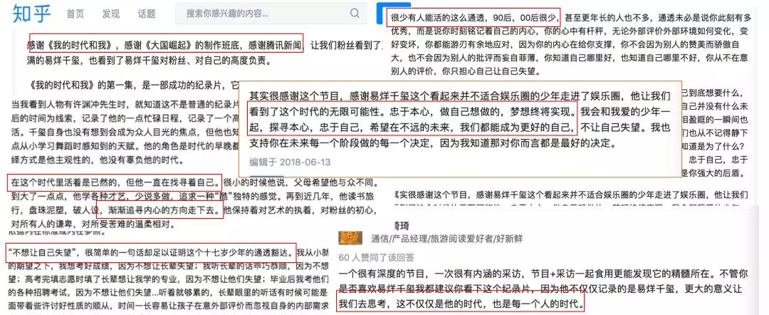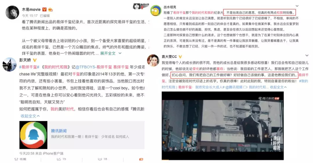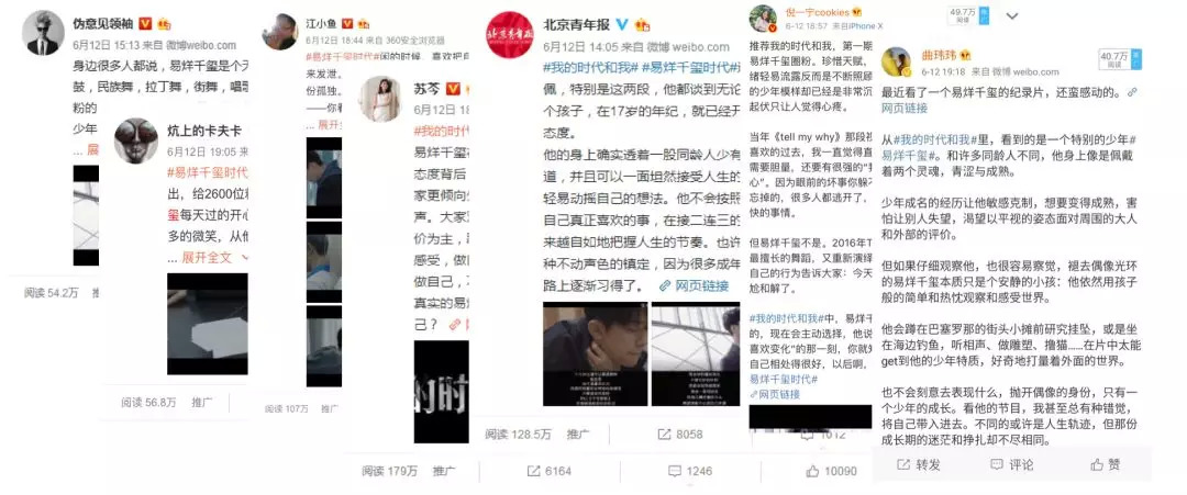 引发粉丝们狂热讨论的,源于易烊千玺接受了《我的时代和我》这档节目。作为首期嘉宾,节目组通过为期一年的跟踪式拍摄,呈现了易烊千玺在舞台背后的各类场景,并挖掘这个少年偶像对所处的身份和时代的理解。首期播出后,主流媒体和一些意见领袖开始在微博上进行安利。