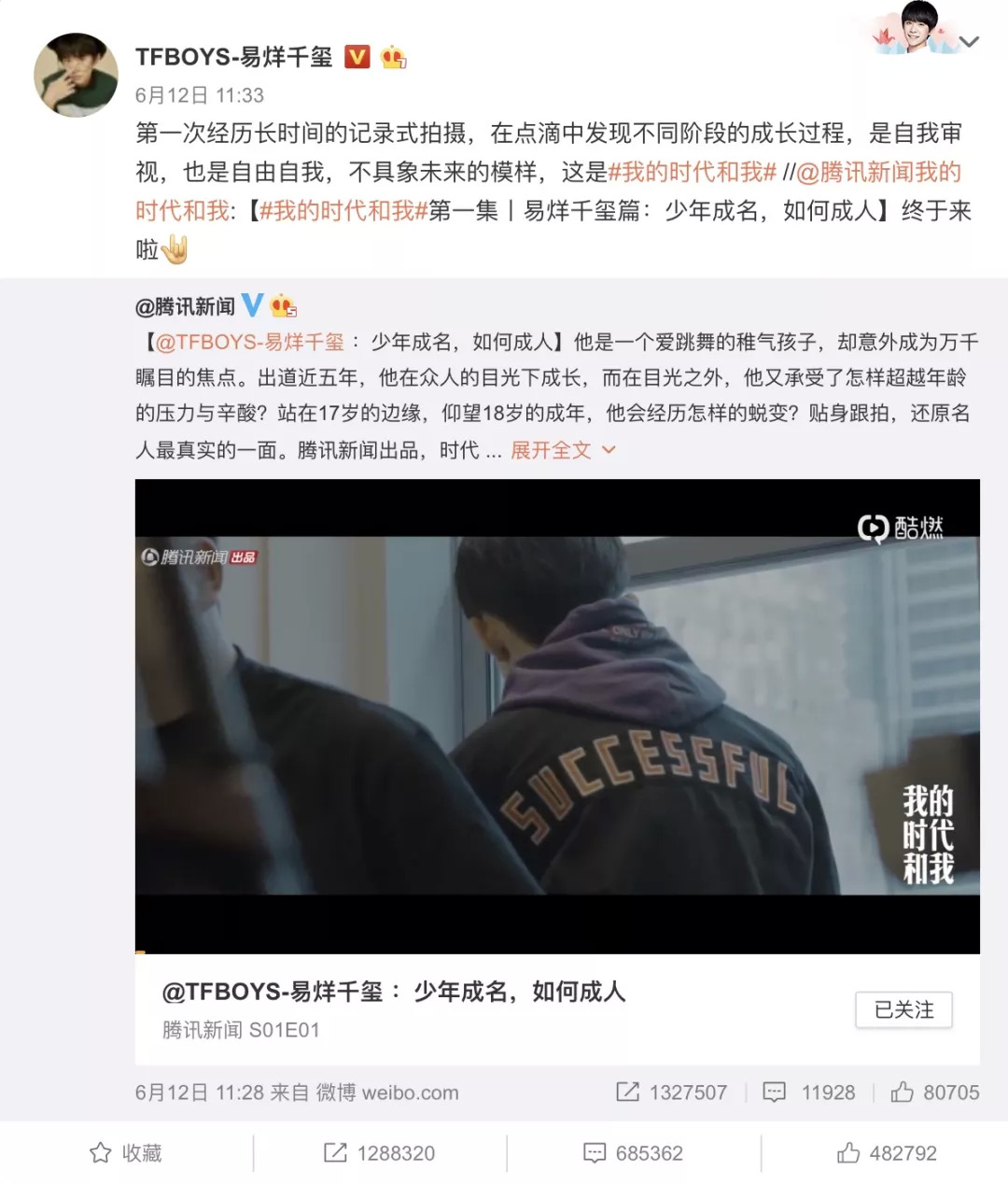 《我的时代和我》播出后,易烊千玺同样在微博上对这期节目进行了转发,收获了超过128万转发,68万评论。