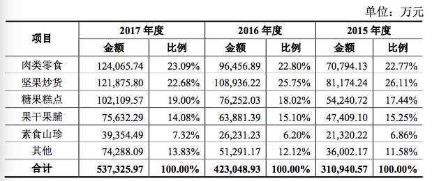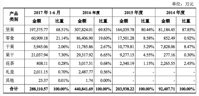 对比而言,三只松鼠业绩严重依赖于坚果品类。据此前三只松鼠的招股书披露,该公司在2014年、2015年、2016年及2017年1-6月坚果产品的销售收入占主营业务收入的比重分别为87.85%、80.44%、69.83%及68.51%。该招股书的风险提示称,这意味着坚果产品的经营情况将直接影响公司的经营业绩,如果未来短期市场需求及消费者消费习惯出现较大变化导致对坚果产品的需求出现巨大波动,将对公司业绩造成较大影响。