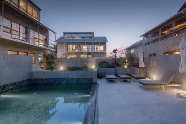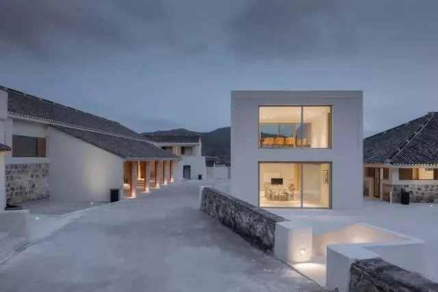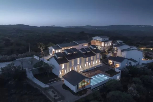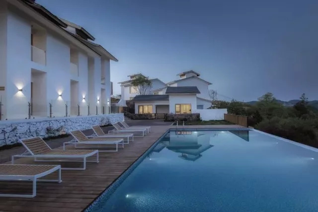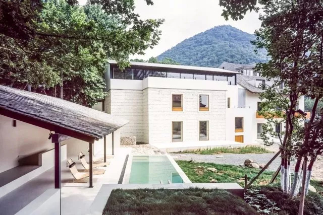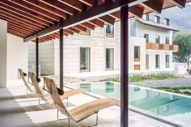 中间的户外区域被功能建筑围绕,包括大公区配套、客房、泳池、温泉,是一个充满安全感的大空间,所有建筑都面向外围,直面风景。通体白墙、落地玻璃是最直观的标识,温泉是标配。