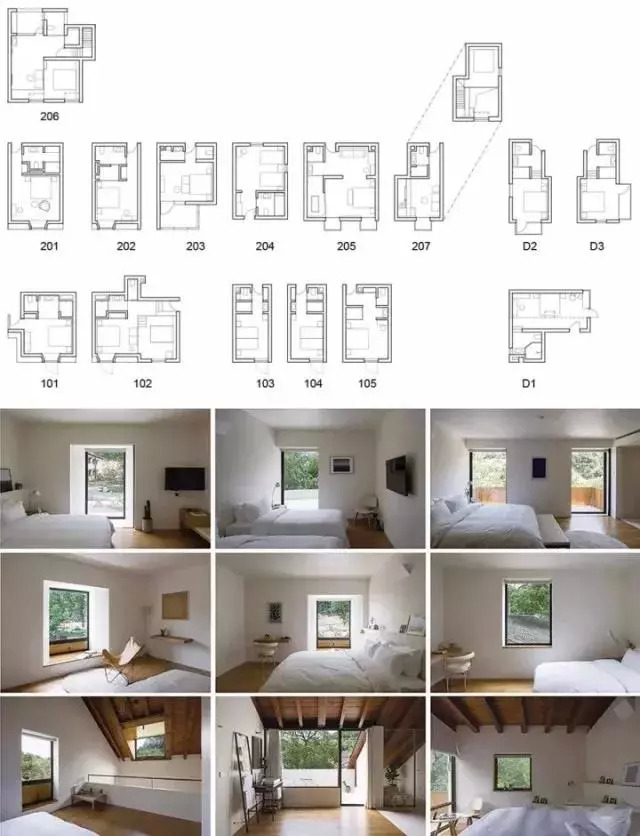 加之房间的片段化,设计上放弃了整体性形式的诉求,转而关注局部的立面秩序,从而形成了15间各异的客房。