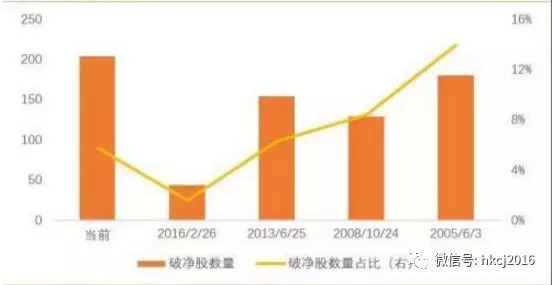 据市场公开数据,沪指5年前于1849点见底时,两市破净股数量是158只;2008年见底1664点时,两市破净股有173只;2005年沪指跌至1000点筑底时,两市破净股达176只。WIND数据显示,按上一个交易日收盘价计算,今年上半年两市共有202只股票破净,已刷新历史记录。缔造记录的还有创业板,创业板开设9年来首次出现破净,有南风股份、豫金刚石、振东制药、联建光电等。周期性行业是破净主力军,银行、券商破净家数快速上升,其中银行已有一半个股破净。