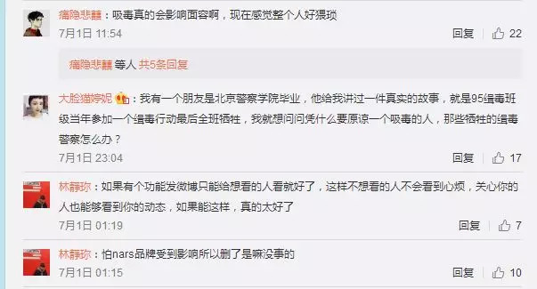 目前,虽然上述柯震东发布的微博已经删除,但在其6月27日发布的其他微博内容下,消费者仍在表达对其吸毒行为以及为NARS站台一事的愤慨。