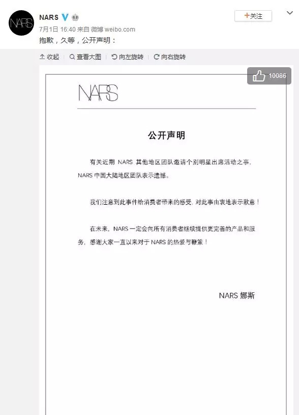昨日(7月1日),NARS在其品牌官方微博发布了声明,但这纸声明被网友质疑敷衍应付。对于该事件,今日慧慧第一时间向资生堂(中国)投资有限公司公关部门求证,截至发稿,尚未收到回复。