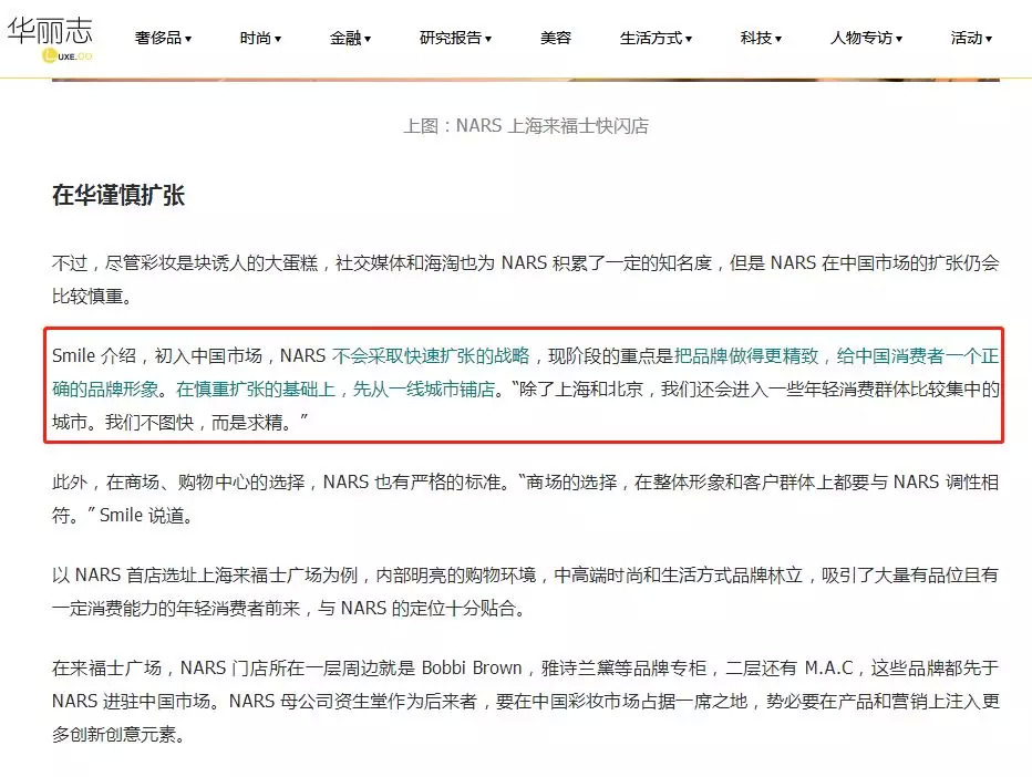 在该报道中,NARS 中国区市场总监Smile表示,选择此时进入中国市场,跟当下消费者的需求契合,正好踩在了点上,而对中国市场的布局,第一阶段重点是把品牌做得更为精致,“给中国消费者一个正确的品牌形象”。
