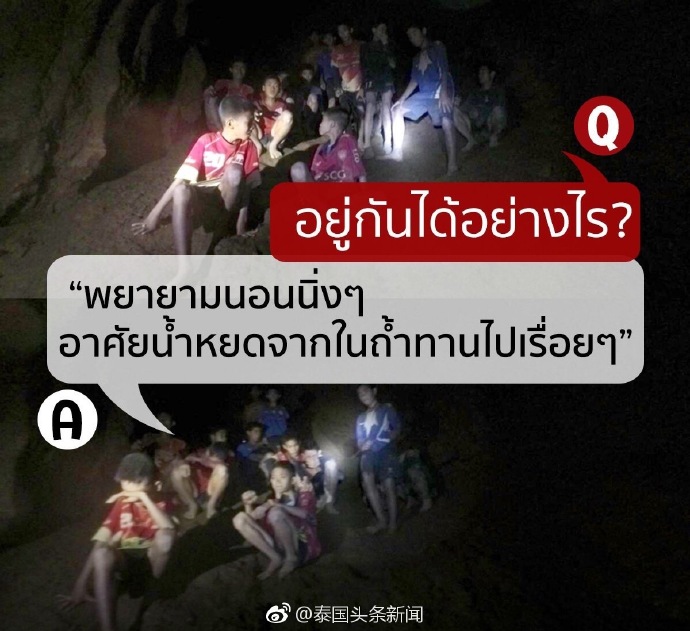 另据泰国头条新闻官方微博消息,获救后,受困的13人坐在一块大石头上不停感谢搜救人员的到来。一名少年向搜救队员提问:“今天星期几?”搜救队员说:“今天星期一,你们已经呆在这里10天了!你们身体很好,很厉害!”少年继续问说:“现在超级饿!”搜救队员安慰他们:“我懂!已经派人去拿啦!”