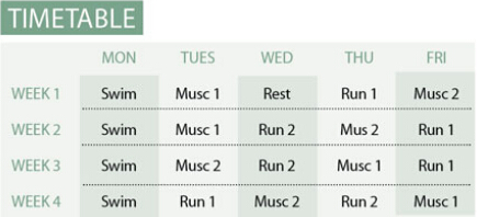 游泳:在水中进行5分钟的热身运动、踢腿和100米走步,然后进行总距离为600到700米的混合泳冲刺,每次50米,间歇60秒,最后进行200米的慢速自由泳来放松。