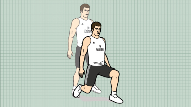 做出弓步,确保膝盖超过脚趾,以弓着的腿为中心旋转身体,然后站起来,用另一条腿重复动作,每条腿各做10遍。