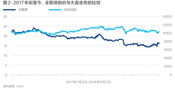 然而,资本市场是无情的,在投资者眼中,走得太慢就意味着不确定性太多。2007年上市之初,全聚德曾一度受到资本市场的热捧。2007年在深交所挂牌当天全聚德的开盘价是36.81元,其后的股价走势基本与大盘持平,然而从2017年3月达到24.39元的阶段性高点后,这家公司的股价走势逐渐被大盘甩开。