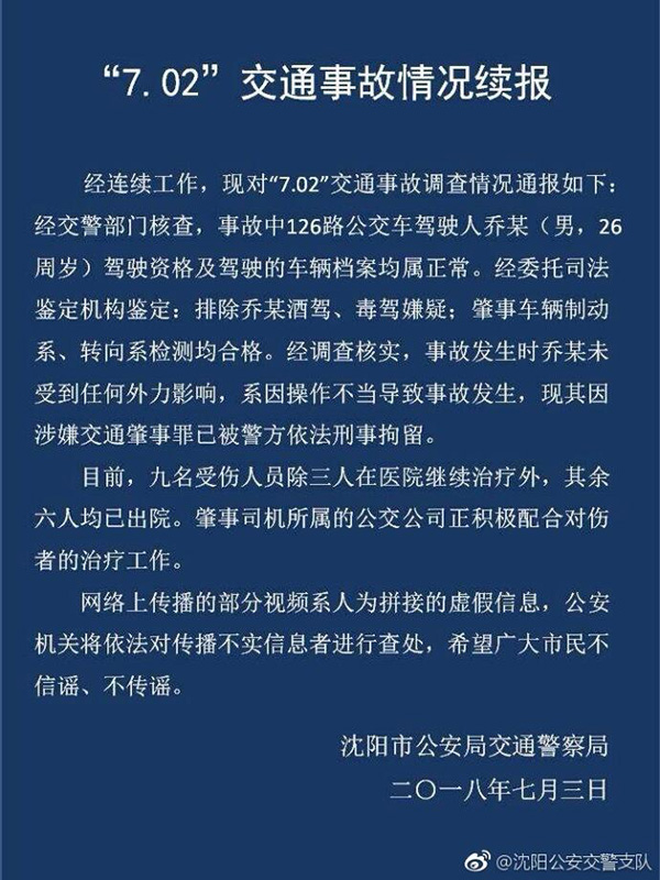 7月3日,沈阳公安交警支队通报了事故情况,称事故系因驾驶员操作不当导致。