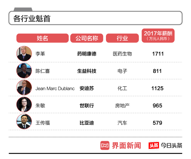 界面联合今日头条发布2018中国A股上市公司CEO薪酬榜。药明康德的总裁李革以1711万元年度收入拔得头筹,5月刚上市的药明康德相当骁勇,连续收获16个涨停板。伊利股份的总裁潘刚和安迪苏的总经理Jean Marc Dublanc,分别以1487万元和1125万元位列二三名。排名第四的是万达电影的总裁曾茂军,他在2017年将978万元年薪收入囊中。榜单第五名是世联行的总经理朱敏,她在2017年收获了965万元薪酬。