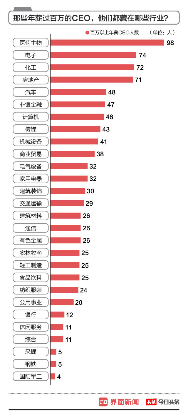 在946位百万薪酬CEO所覆盖的28个行业中,医药生物、电子、化工是产生百万年薪CEO最多的三个行业,其中医药生物行业傲视群雄,以98名百万年薪CEO彰显了行业的不凡实力。