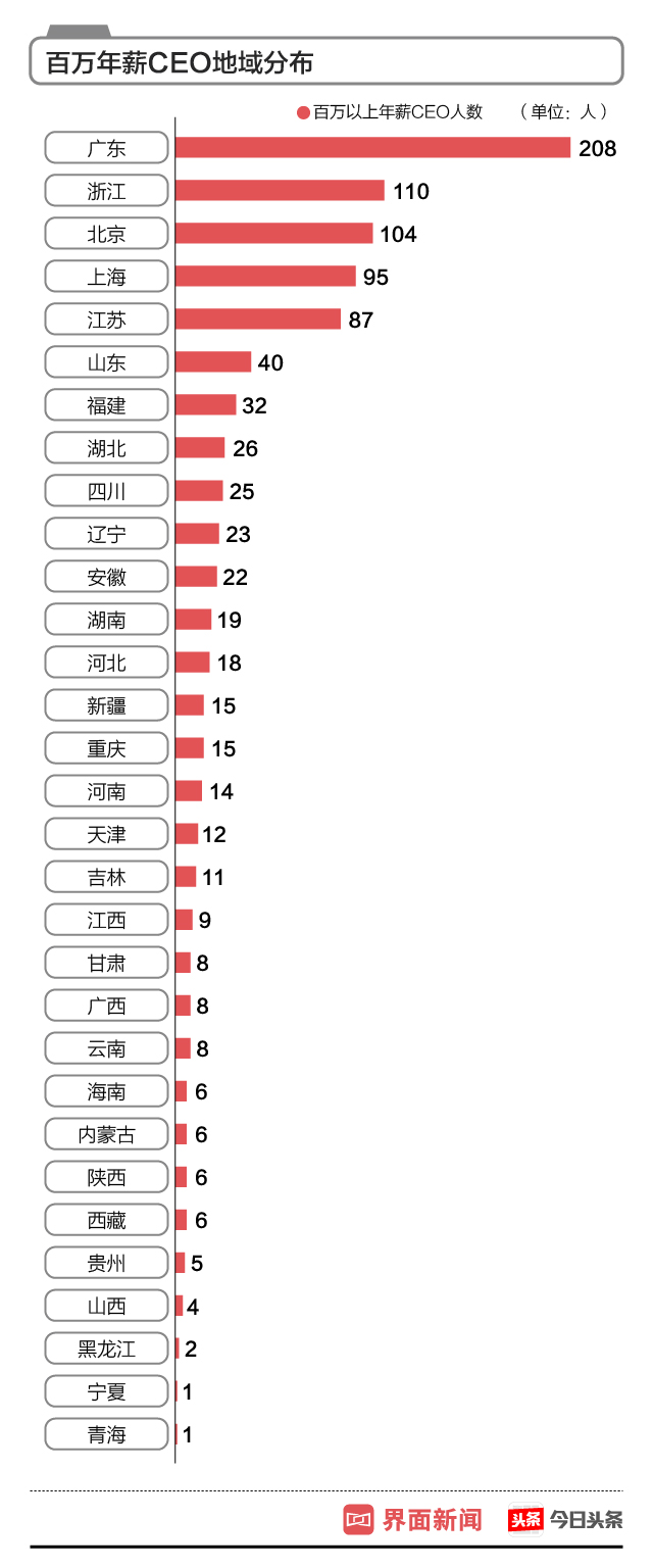 从A股上市公司所在地来看, 广东当之无愧成为百万年薪CEO的盛产地,产生了208位百万年薪CEO,浙江和北京紧随其后,分别为110位和104位。