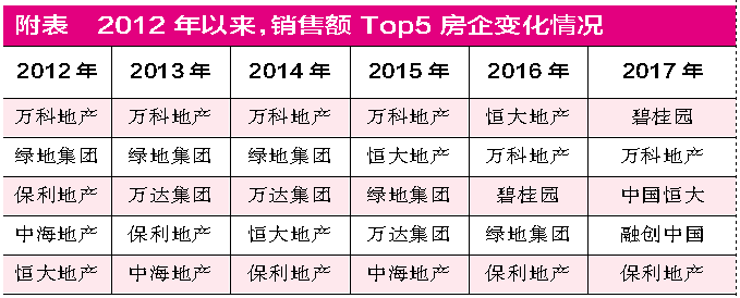 以碧桂园、万科、恒大、融创、保利为代表的地产龙头已经跻身2017年地产行业前5强,随着房地产行业“马太效应”的持续发酵,加之低估值优势的凸显,不乏长期投资机会。不过《红周刊》记者同时注意到,自2012年以来,以销售额划分的前5大房企排名几经变化,有进有退(附表)。