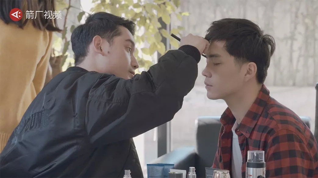 阿杰的眉毛黑浓,但后半部分有些参差,化妆师保留了那些粗犷的参差部分,只是在眉尾补收出一点形状。这时候,遮瑕吸收得差不多了,修容笔接着扫过腮骨和鬓边。阿杰几乎全程闭着眼。