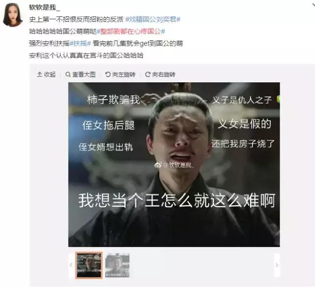 史上最委屈反派——热播剧《扶摇》里的国公自以为把所有人玩弄在股掌之中,事实上,却被众人耍的团团转,被王上吃的死死的。剧中国公为王位可谓是处心积虑了几十年,奈何辅助太弱,只他一个人战斗力可观,扛起大局。眼看国公就要摸到龙袍了,结果假世子出现抢人头。网友不禁心疼起国公来,表示要众筹给国公做龙袍,这个反派恨不起来。