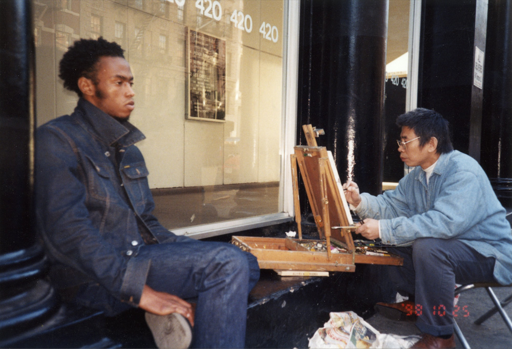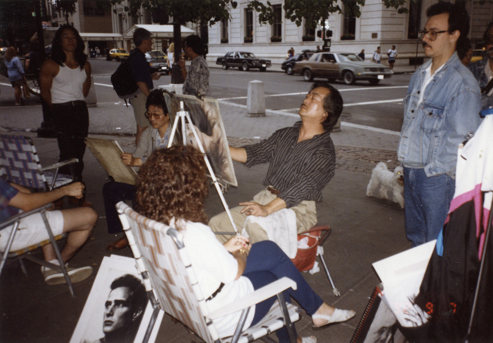 1991年8月18日凌晨一点多,格林威直村西四街临近第六大道的性商店旁边,几个中国画家在为路人画像,旁边聚集着一些围观者。灯光昏暗,时间渐晚,喧嚣声也静了下来。在路边画像的画家中有张泽平、我、张宝琦、倪军、魏小峰、冯良鸿。性商店的旁边是是一家半地下的店铺,终年封着门,我们便在橱窗一侧的便道上毫无顾忌地将画架支起来,招揽生意。