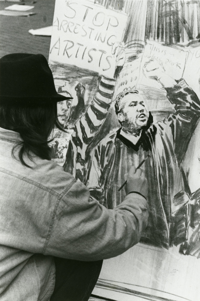 这种抗争、呼喊的方式在我居住纽约的十八年中,时有发生,日有所闻。而艺术家反对暴力、反对歧视、争取言论自由、生存自由、反对警察骚扰街头艺术家画像与卖画谋生的诉求与抗争,在90年代中以及后几年更为激烈。1993年反对纽约警察骚扰、拘捕街头艺术家谋生自由和90年代中对纽约市长朱利安尼以及纽约警察局侵犯宪法第一修正案的法律诉讼,在漫长的诉讼过程中一直闹到最高法院,几年之后终于艺术家获胜,获得了言论自由、创作自由以及在纽约街头展示与谋生的权力。