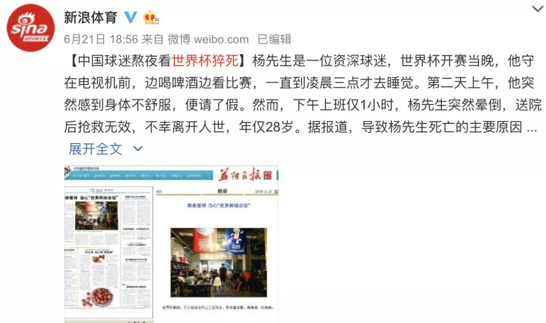 今年6月,28岁的湖南球迷,因天天熬夜看球,上班时猝死。