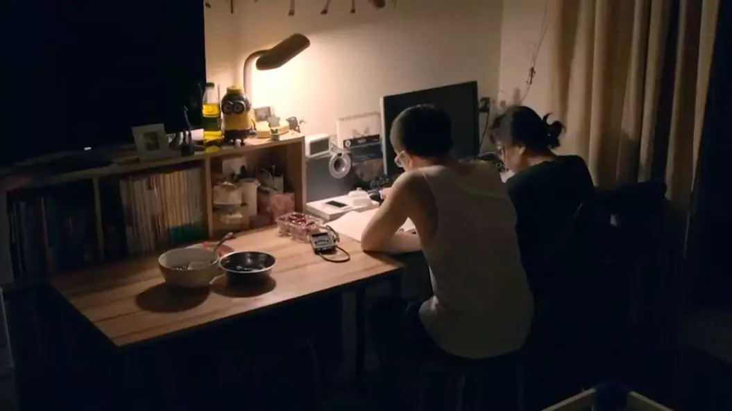 晚上十点,好不容易哄睡孩子,小两口借着昏暗的灯光,抓紧时间看书学习。