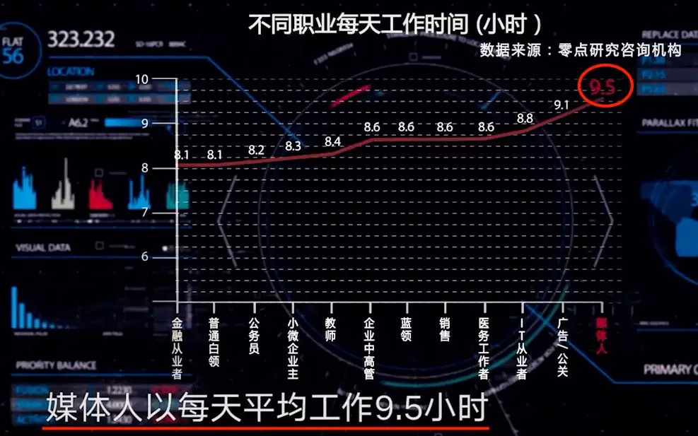 其中,媒体人以每天平均工作9.5小时,平均睡眠6.5小时,成为工作最久,睡得最少的职场人士。广告公关、IT从业者、医务工作者紧跟其后。