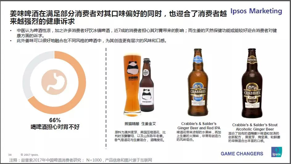 其中,姜味啤酒是一个比较具有东方特色的小品类。中医认为啤酒性凉,加之许多消费者好饮冰镇啤酒,近7成的消费者担心其对胃带来的影响;而生姜的天然保健功能或能较好迎合消费者对健康方面的诉求。此外姜味可以很好地融合在不同风格的啤酒中,为其创造更有层次的风味和口感。