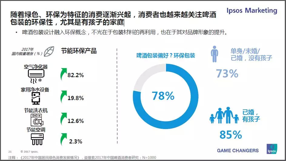 你可能想不到消费者对环保材料如此深情,78%的被调查者在啤酒包装中有“环保偏好”,已婚有孩子的被调研者中,甚至有85%的人更钟情环保材料。