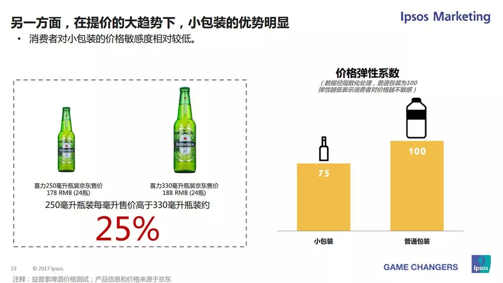 喜欢小包装啤酒最主要的原因不是因为酒量不好,而是易于与他人分享。此外,小包装还比较容易降低价格敏感度,以喜力啤酒250毫升瓶与330毫升瓶装相比,前者装每毫升售价高于330毫升瓶装约25%。
