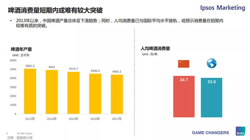 2013年以来,中国啤酒产量总体呈现下滑趋势,但人均消费量已与国际平均水平接轨,因此,短期内消费量难有质的突破。